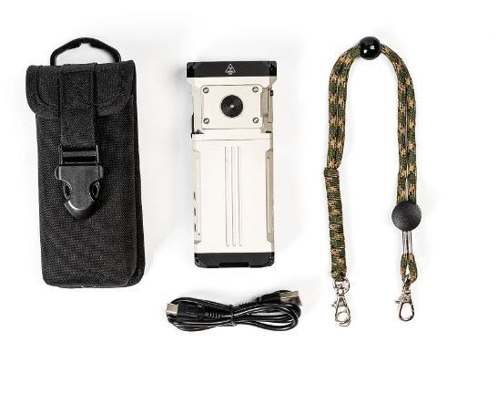 Содержимое упаковки: 1 фонарик X1, 1 чехол, 1 зарядный кабель и 1 шнур для переноски.