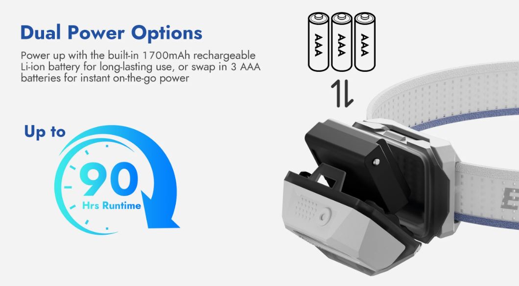 Двойное питание: встроенный аккумулятор емкостью 1700 мАч или возможность замены трех батареек типа AAA прямо на ходу.