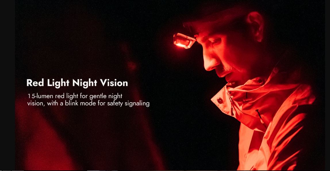 Красный фонарь ночного видения: 15-люменовый красный свет с режимом мигания для мягкого ночного видения и подачи сигналов безопасности.
