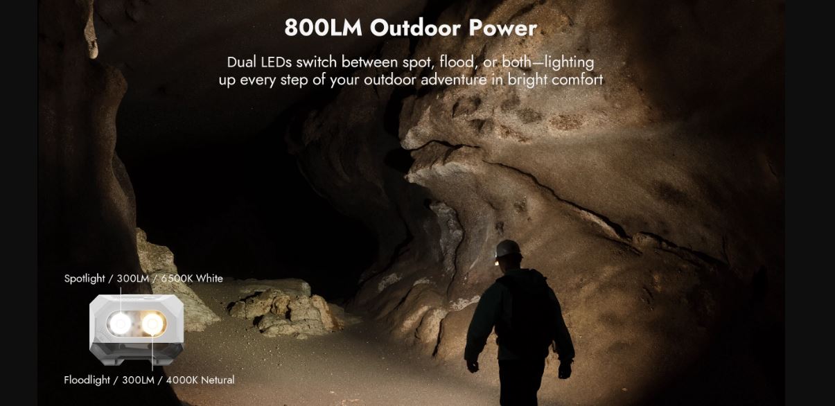 Двойной светодиодный фонарь мощностью 800 люмен: легко переключайтесь между режимами дальнего точечного света, широкого заливающего света или обоих режимов для полного освещения вашей тропы.