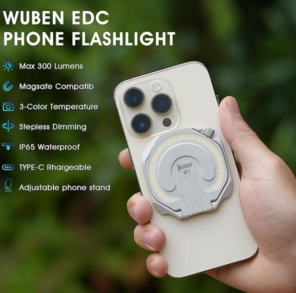 ФОНАРИК ДЛЯ ТЕЛЕФОНА : WUBEN E1 — первый фонарик для мобильного телефона от бренда WUBEN. Оснащенный передовыми светодиодами SMD3030 и функцией регулировки яркости, он позволяет настроить свет под любую ситуацию. Работает от аккумулятора, обеспечивая максимальный световой поток 300 люмен и максимальное время работы аккумулятора до 70 часов (в режиме «Низкий»). Вес всего 38 граммов делает его удобным для переноски. Этот компактный и мощный EDC-фонарик изменит ваши представления об освещении в пути.